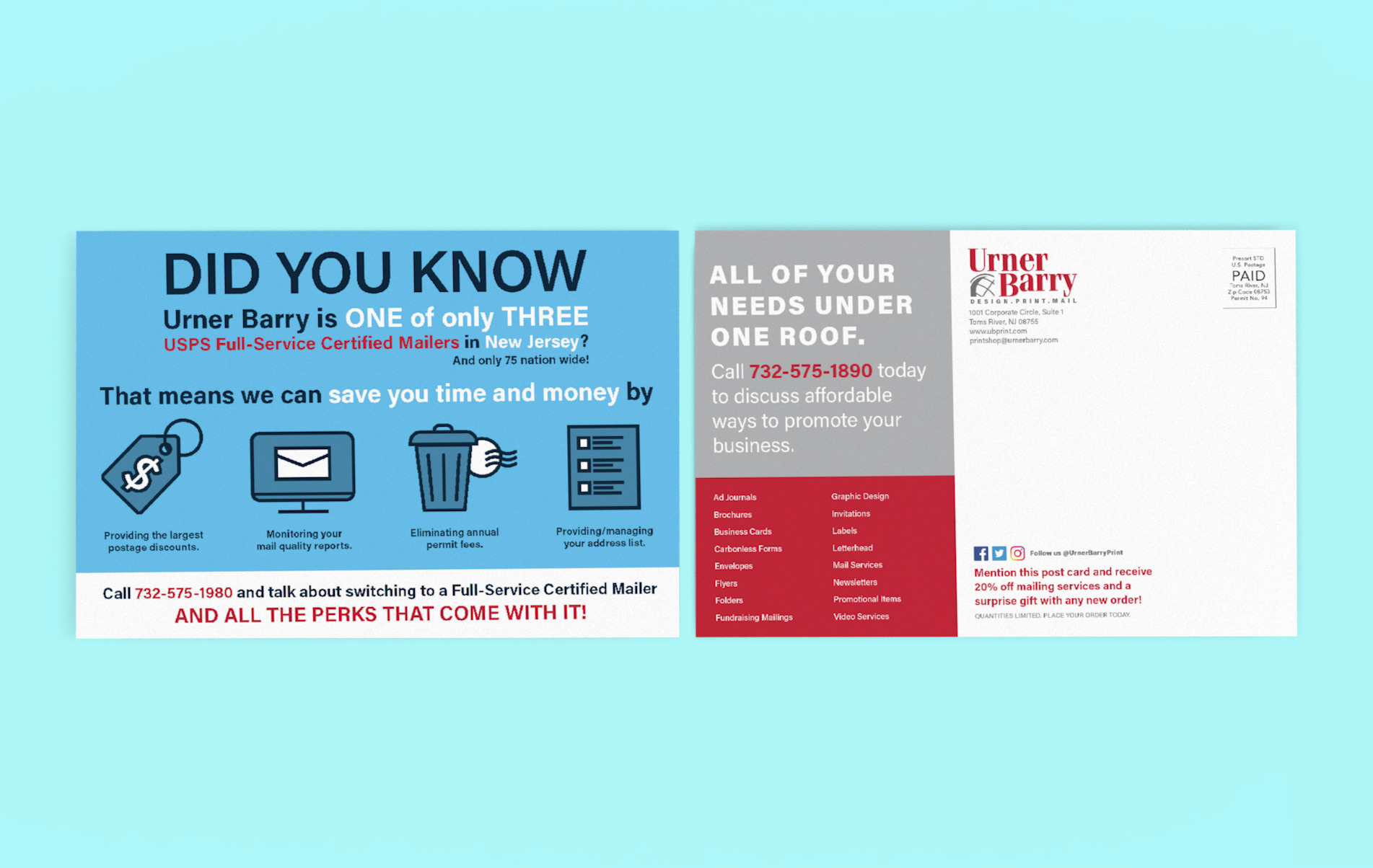 A post card mailed out to prospective clients advertising our Full-Service Certified Mailer capabilities.